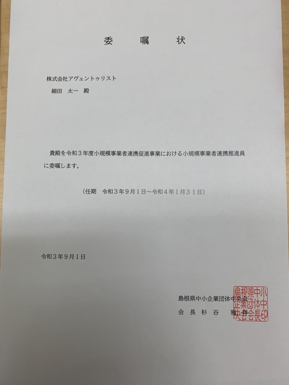 弊社代表が島根県中小企業団体中央会様より組合等の立ち上げを推進する『令和3年度小規模事業者連携促進事業における小規模事業者連携推進員』に任命されました。